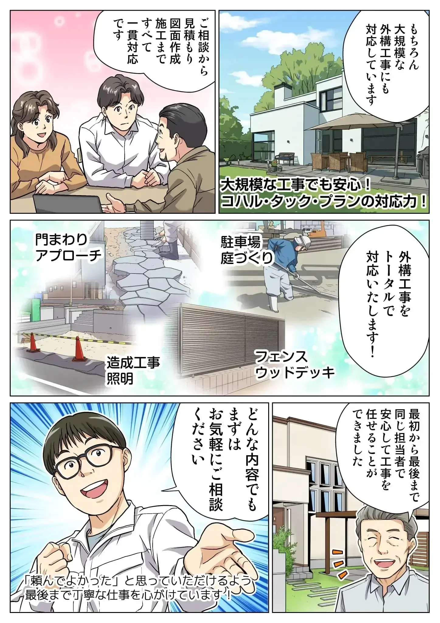 コハル・タック・プランは、新築外構から小規模な改修・補修工事まで幅広く対応する外構工事会社です。見積もりから施工、引き渡しまで一貫して対応し、「どこに頼めばいいかわからない」という不安に、誠実な仕事でお応えしています。